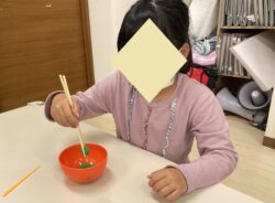 お箸の練習を頑張っているお子さまは、ゆっくり丁寧にものを掴む練習をしました。
