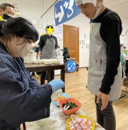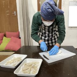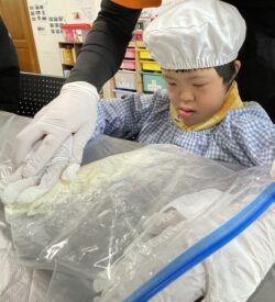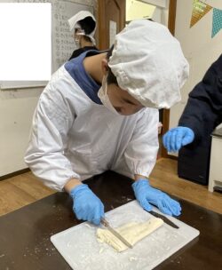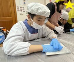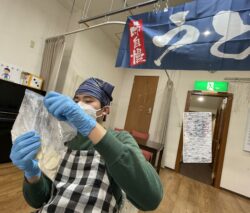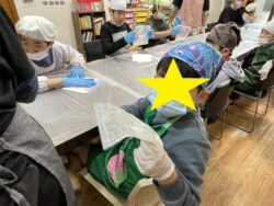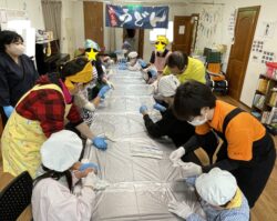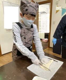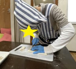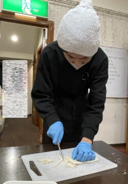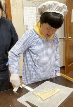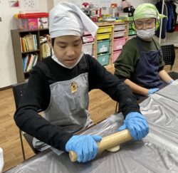 みんなで踏んだ生地を綿棒で伸ばしていきます。