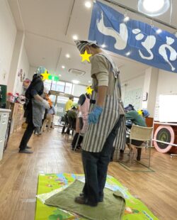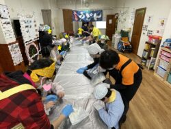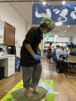 この上にタオルをかけて、おともだちとスタッフみんなで順番に踏んでいきます。