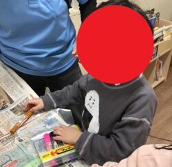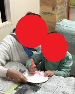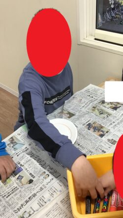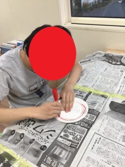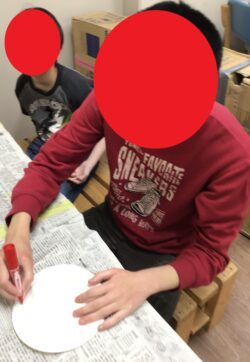 好きな色のペンを選んで紙皿の外縁を塗っていきます。