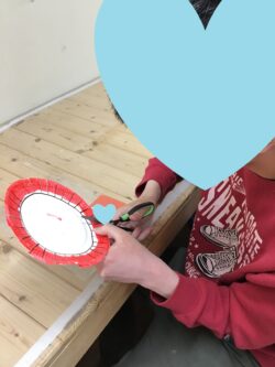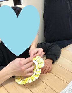 白い紙皿に色を付けて、線が引いてある箇所を切ったり…✂