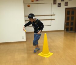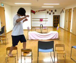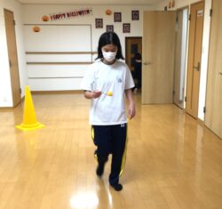 まずはイス渡り。高学年は高いイスと低いイスを組み合わせて難易度アップ!