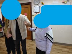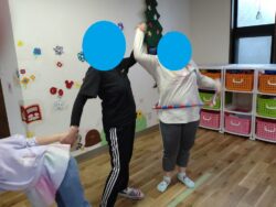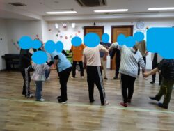 最後は輪になって皆様で二つのフラフープを同時に違う方向へ送ります。