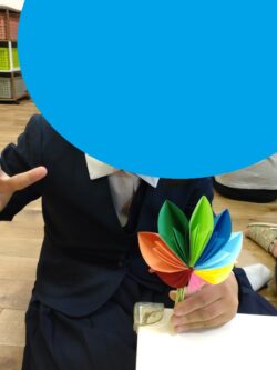 スタッフの指示で両面テープを剥がし、カラフルな花びらを作って、