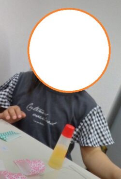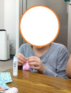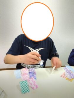 うろこのパーツを作り、本体となる色画用紙に貼り付けていきます。
